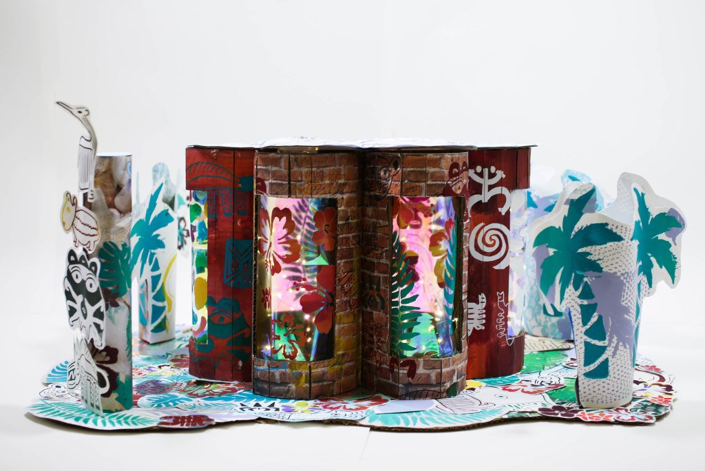 Indigehouse is a manifestation of my cultural upbringing and being surrounded by colors in the tropics. It lives on an island full of foliage and palm trees. In the center lies the main structure, a house shaped like the Taino sun symbol with 6 large bay windows. Every aspect of this house is covered with symbols from my Taino and Incan indigenous background. Inside lives Oscar, my 4-month-old hamster, peering out into the world. The collage of foliage and animals on the island are a nod towards my chaotic upbringing and the chaos of my work that I am surrounded with, both in reality and now physically. The choice for the tropics was simple: I have spent most of my life in South Florida in a pink house with pastel-colored rooms. It is an homage to my past and a manifestation of my future, preferably where I will live after retirement. This house is a reflection of my identity and who I have become today as well as who I hope to be tomorrow.