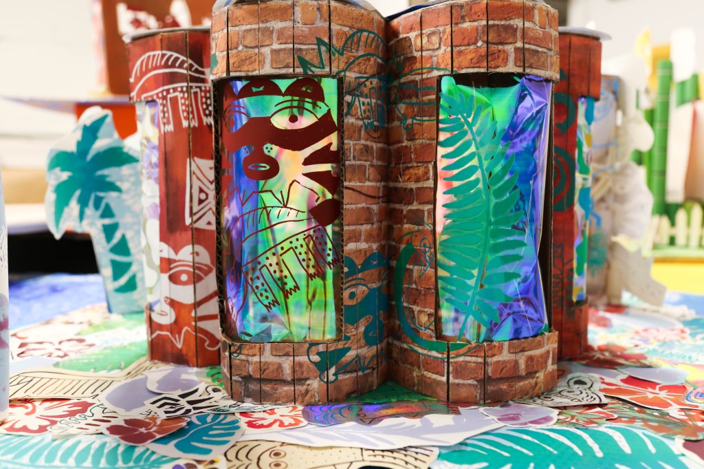 Structure made of screenprints, iridescent cellophane, and cardboard